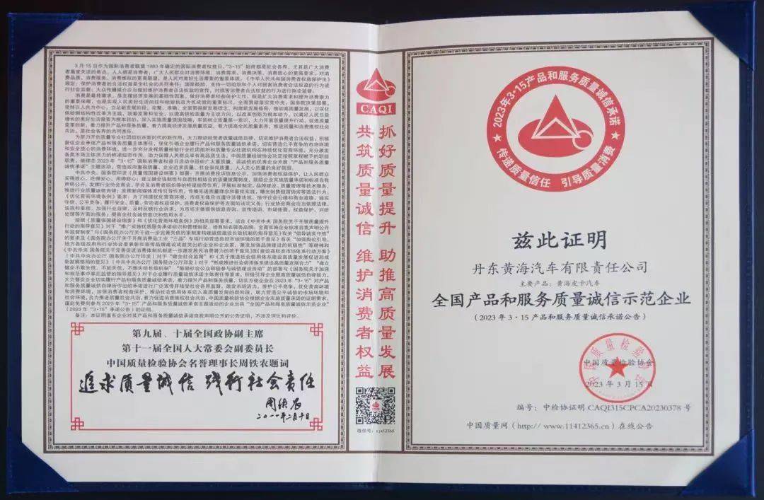中国质量检验协会由国家市场监督管理总局主管的质量检验行业组织和质量专业社团机构,在传递质量信任、引导质量消费、向众多购买的人提供权威可靠的质量消费信息等方面发挥着权威作用。此次获奖,标志着黄海汽车在产品的质量、客户服务、规范经营和社会责任等方面工作获得了消费者的肯定。下一步,黄海汽车将持续加强产品质量安全生产与研发体系建设,以客户的真实需求为导向,诚信经营与品质保障并驱,筑牢高水平质量的发展基石,用心为广大购买的人带来优质的产品和服务。