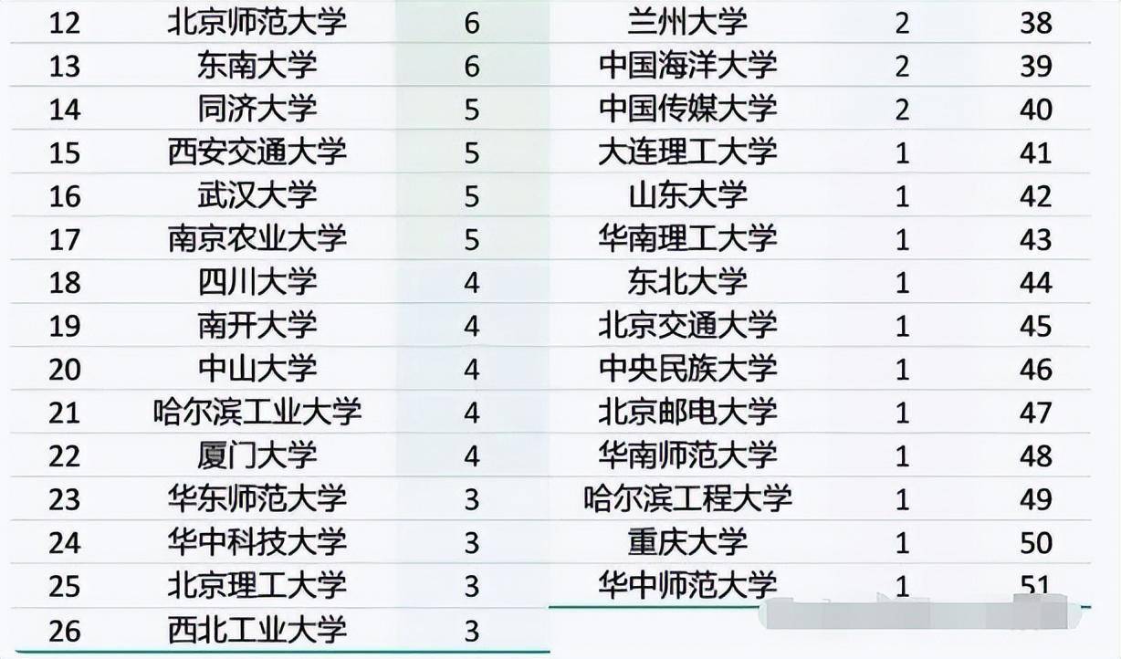 剩余的便是只具有两个A+学科或许一个A+学科的高校了,包括第32名的天津大学,第33名的吉林大学,第34名的西安电子科技大学,第35名的电子科技大学,第36名的南京理工大学,第37名的上海财经大学,第38名的兰州大学,第39名的我国海洋大学,第40名的我国传媒大学,第41名的大连理工大学,第42名的山东大学,以及第43名的华南理工大学等等。