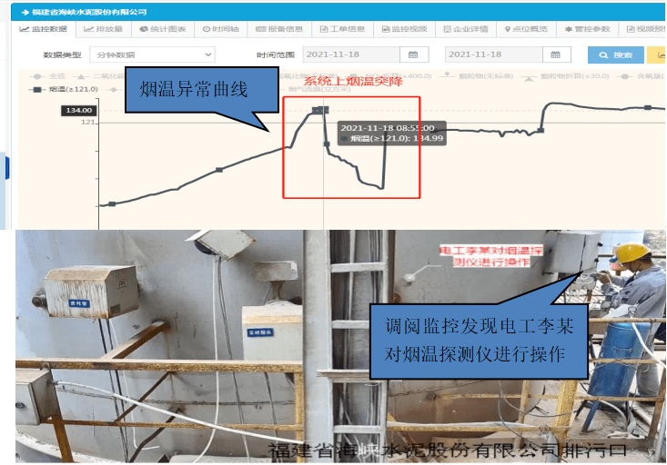 2021年12月7日,泉州市生态环境局执法人员通过福建省生态云污染源监控管理系统发现,福建省海峡水泥股份有限公司窑尾烟气烟温于2021年11月18日10点左右出现异常降低,同时各项污染物数据异常。