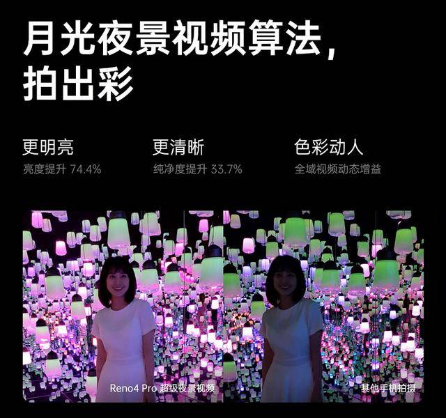 不过,在最近发布的新一代 5G 视频手机 OPPO Reno4 系列上,对夜景视频拍照供给了新的解决方案,在搭载的 ColorOS 7.2 下,OPPO Reno4 系列支撑全新的超级夜景视频功用,新参加的「月光夜景视频算法」让拍照画面更亮堂,可以一起作用于主摄与超广角摄像头上,让本来本质极高的拍照模组发挥出更高明的视频夜拍作用。