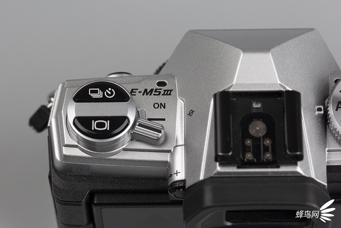 奥林巴斯E-M5 Mark III在机身顶部有着明显的变化,模式拨盘的位置由机身顶部左侧调整到右侧,以便于更好地操作,而机身左侧位置除了开关外,原来的模式切换转盘改为了连续拍摄/计时器按钮和实时取景视图切换的按钮。