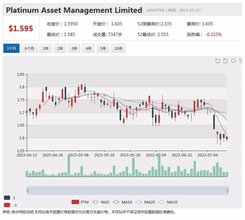 公告发布后,Platinum股价周三早盘跌落。10:30成交价为1.598澳元,跌落0.0025澳元,跌幅0.16%。该股近一年的出资回报率为亏本8.71%。