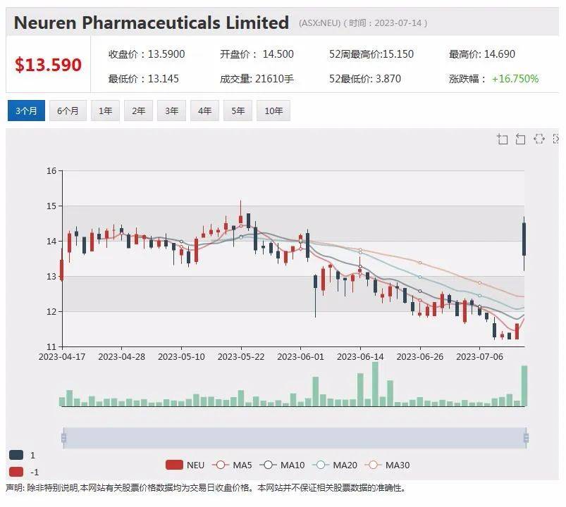 受该公告影响,Neuren股价周五早盘大涨。11:36成交价为13.47澳元,上扬1.83澳元,涨幅15.72%。该股近一年的出资回报率为236.75%。