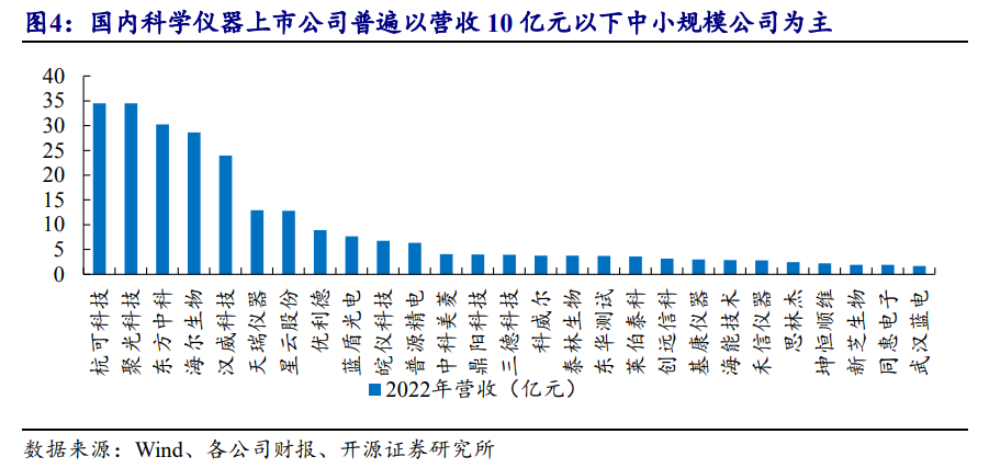 相比之下,中国目前尚未培育10亿美元以上的仪器公司,最高也在5亿美元左右,差距较为明显。目前国内营收最为领先的上市公司为聚光科技、东方中科等,2022年营收在30多亿元(约5亿美元),整体营收和市值上均以中小公司为主,外资优势仍然较为稳固。
