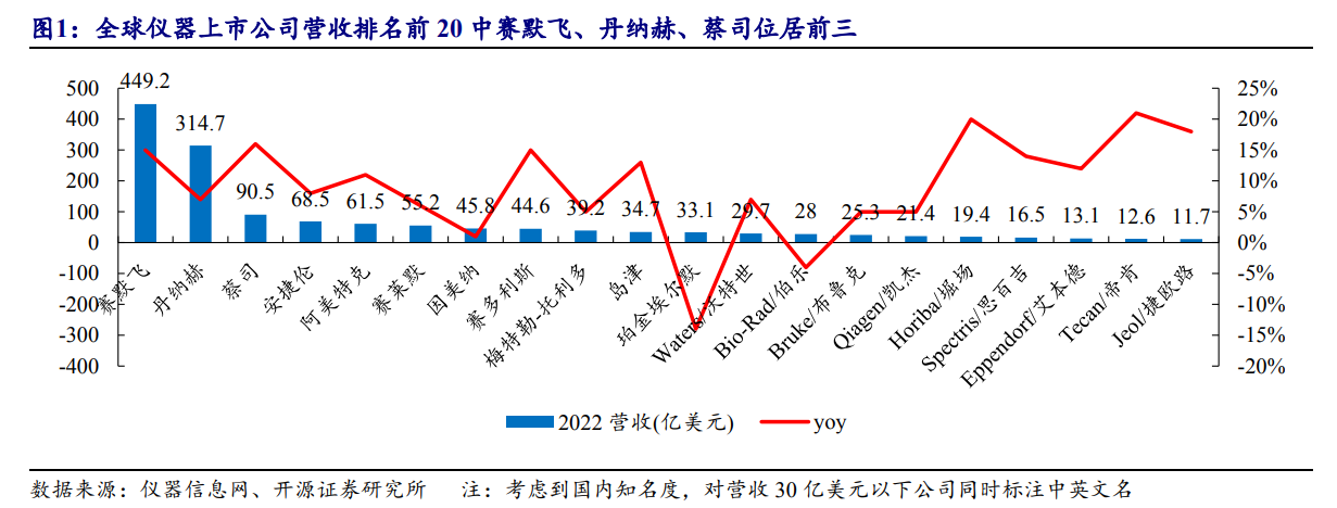 回顾2022年全球上市仪器公司营收情况,前20仪器公司平均营收达到70.74亿美元,平均增长9%。20家公司中仅有两家出现下滑;全球仪器龙头赛默飞2022年营收增长15%至339.2亿美元,第二名丹纳赫增长7%至314.7亿美元。