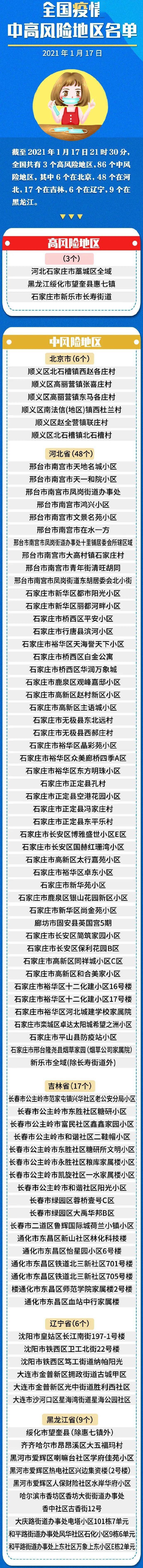据河北省卫健委网站1月17日音讯,依据国务院应对新冠肺炎联防联控机制关于科学区分、精准防控等作业要求,自2021年1月17日起,将石家庄新乐市长命大街调整为高危险区域,将石家庄长安区简筑家乡小区、保利花园B区,高新区同祥城小区C区、和合美家小区,裕华区十二化建小区16、17号楼、河北城建校园家属院,栾城区卓达太阳城期望之洲小区,平山县防疫站小区,邢台隆尧县烟草家乡(烟草公司家属院)调整为中危险区域。