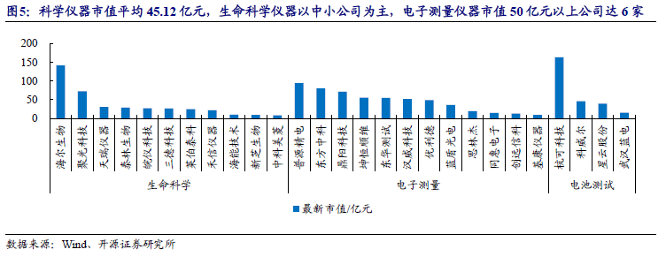 总市值方面,科学仪器当前整体市值1218亿元,其中电子测量、生命科学、电池测试市值分别达550、403、265亿元,近两周均出现收缩。