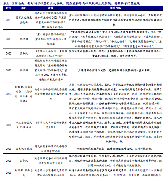 基于上述总领性、规划性政策的指导,国家各部委针对科学仪器的实际发展推出了相关规范性法律、规章推动行业规范化,如2022年《中华人民共和国计量法细则》便有利于电子测量、实验室仪器等领域的标准统一和良性发展;同时国家还进行一系列财政支持、税费优待等激励政策,如“研发机构采购国产设备增值税退税管理办法”对国产设备做财政支持,而科技部还专门出台了“重大科学仪器设施研发”重点专项年度项目以支持学术和产业界突破科学仪器的瓶颈。
