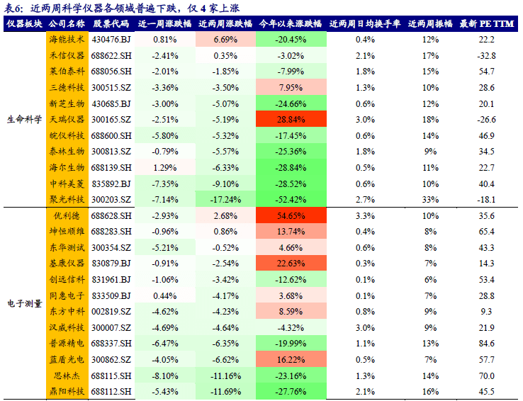 从具体公司表现来看,近两周板块呈现普跌。生命科学领域近两周海能技术领涨(+6.69%),禾信仪器微涨1%以内,其余均经历下跌;电子测量仪器领域大多下跌,优利德领涨(+2.68%);电池测试仪器受到表现相对最弱,4家公司均出现2%以上下跌。活跃度方面,近两周优利德、聚光科技交投较为活跃。