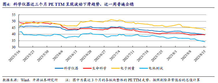 科学仪器整体PE TTM本期初(8.1)为42.3X,期末(8.15)为39.5X。回顾历史估值走势,三个月前科学仪器整体和各个细致划分领域主要在45X左右波动,目前估值水平有不同程度下滑。分板块来看,生命科学及电池测试板块估值中期走势弱于板块,其中生命科学仪器自接近50X回落至40X左右,电池测试自三个月前的40X左右下滑至35X以下,近两周持续下滑;电子测量近一个月持续下滑,但从近三个月的中期视角来看下滑幅度相对不多,表现在三者中最强。