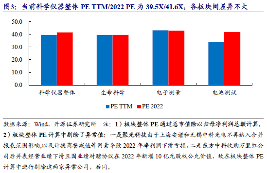 本期末科学仪器板块整体PE TTM为39.5X。各板块PE方面,生命科学当前估值继续下行,PE TTM为39.5X;电子测量PE TTM为43.3X,下行后估值仍高于仪器整体,是目前估值最高的板块;电池测试估值相对最低,PE TTM为34.1X。