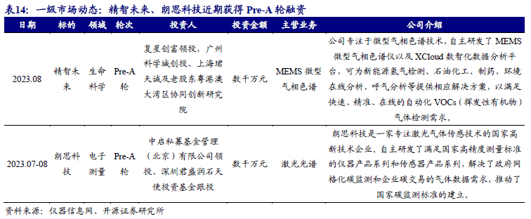 一级市场方面,精智未来近期获得Pre-A轮融资数千万元融资,该公司聚焦MEMS微型气相色谱仪;朗思科技近期获得Pre-A轮融资数千万元融资,公司专注激光光谱气体传感技术。