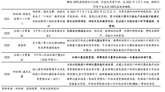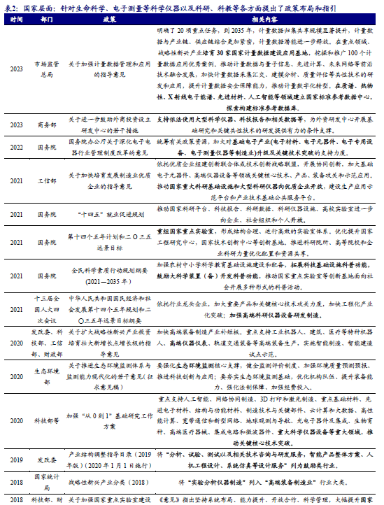 近五年国家层面的仪器有关政策涵盖了每个方面,下表主要梳理了国家各部门对生命科学、电子测量等科学仪器的直接引导性政策,以及针对科研发展和投入、科教布局、研发性产业推进等方面的政策。