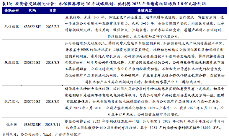 1)公司经营管理相关公告:鼎阳科技正式公开发布SHN900A系列全双端口手持式矢量网络分析仪;优利德、武汉蓝电、奥华电子、中科美菱发布半年报,前三家均实现业绩同比增长,其中武汉蓝电收入盈利增速最快;普源精电成功获得第二十四届中国专利金奖,且公司入选国家级专精特新“小巨人”企业。2)长期资金市场、持股变动相关公告:聚光科技股东普渡科技本次减持计划时间已届满,计划未来六个月进行600万股减持;博迅生物网上获配比例为 0.28%,股票于2023年8月17日在北京证券交易所上市。3)投资者交流相关公告:禾信仪器布局10年战略规划,远期目标是质谱产品进入全球前列,持续通过并购成为全世界知名科学仪器公司;优利德表示2023年业绩考核目标为1.8亿元净利润。