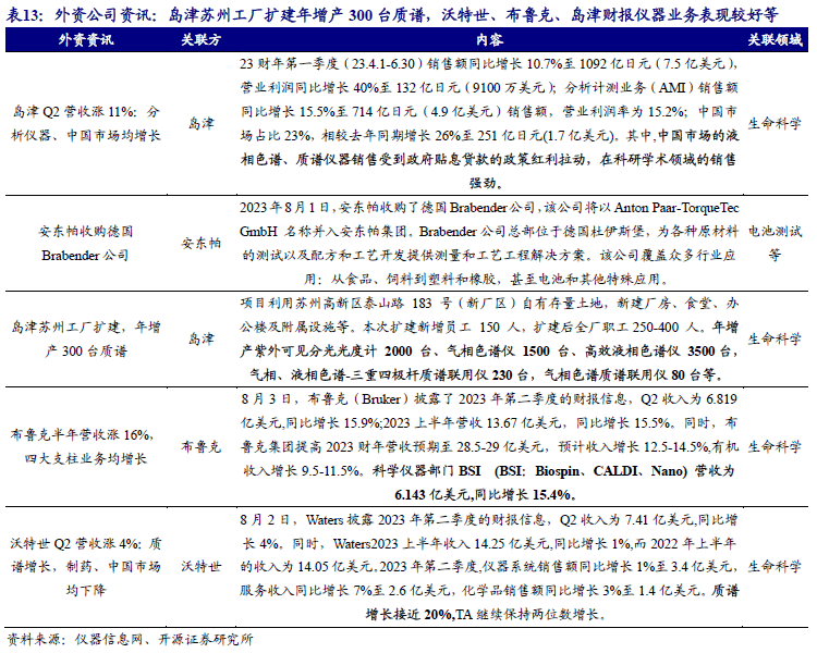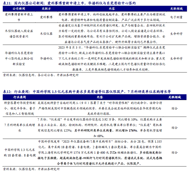 1)国内厂商要闻:爱科赛博重新申请上市,向科创板发起冲击,基本的产品为精密测试电源、精密特种电源和电能质量控制设备。2)行业方面:中国科学院1.3亿元采购18套质谱、8套电镜,其中多功能场发射扫描电子显微镜、超高效液相色谱-四级杆飞行时间质谱联用仪、质谱流式系统、流式电感耦合等离子体飞行时间质谱仪不允许采购进口产品,仅限国产。3)外资方面:岛津苏州工厂扩建年增产300台质谱;沃特世、布鲁克、岛津财报仪器业务表现较好,尤其色谱、质谱等仪器业务表现较为突出。4)一级市场方面:精智未来、朗思科技近期获得Pre-A轮融资。