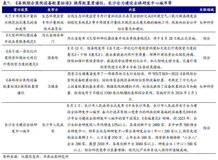 近期各官方机构发布重点政策:一是推荐性卫生行业标准《县级综合医院设备配置标准》推荐配置质谱仪,标准适用于不超过1500床位规模的县级综合医院,实施时间为2024年1月1日。二是长沙全力建设全球研发中心城市,明确到2025年,长沙全社会研发投入年均增速13%以上,各类创新平台实现2600家;到2030年实现各类创新平台3000家,研发企业(中心)500家以上。
