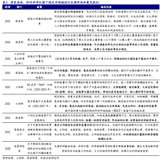 除了对科学仪器直接关联以及科研相关的政策之外,国家层面还针对科学仪器下游应用领域进行了各领域的“十四五”规划、2035年规划等长期布局,也将同步带动科学仪器行业进步。具体包括生物医药、医疗装备、环境发展、能源环保等。