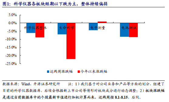 纵观近两周行情表现,科学仪器板块整体涨跌幅为-6.1%,所有板块均出现下跌:1)电子测量近两周下跌4.5%,三大板块中跌幅较小,2023年以来涨幅已缩小至0.9%;2)生命科学继续下行,下跌7.0%,弱于板块整体;3)电池测试仪器继续走弱,板块下跌8.4%,表现相对最弱。(注:若非专门说明,本文讨论行情、估值时均指近两周即8.1-8.15的情况;后同)
