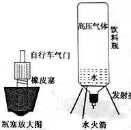 水火箭原理:用塞子塞紧的塑料瓶,构成一个密闭的空间。把气体打入密闭的容器内,使得容器内空气的气压增大,当超越塞子与瓶口结合的最大极限时,瓶子与塞子自在脱离,箭内水向后喷出,取得反作用力,推动火箭升空。