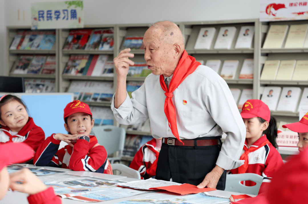 江苏省锡山高级中学试验校园第二小学的队员们走进堰新社区,和全国农业劳动模范、老党员陶听根爷爷一同制造剪报,从一段段赤色故事中感悟持之以恒、乐于贡献的精力。(孟志年 摄)