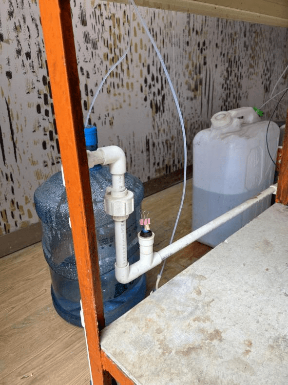 左图为废水自动监测进样管被人为拔出(用长尾夹夹住断开处);右图为废水自动监测进样管插入塑料瓶液面以下(人为调配的替代样品)。