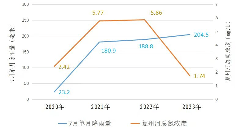 本年6月,复州河三台子断面总氮浓度为2.25 mg/L,创下自2020年水质主动监测站运转以来单月总氮最低浓度值。进入7月,在主汛期强降雨叠加上游水库泄洪的两层效应影响下,河流断面水质极易发生动摇。2020年至2023年,瓦房店市7月单月降雨量分别为23.2毫米、180.9毫米、188.8毫米、204.5毫米,复州河三台子断面对应的总氮浓度分别为2.42 mg/L、5.77 mg/L、5.86 mg/L、1.74 mg/L。本年7月的几轮强降雨进程,复州河总氮浓度动摇不大,一直保持在较低水平。除了总氮浓度创下新低之外,复州河三台子断面其他首要污染物浓度也保持在较低水平,7月三台子断面为Ⅱ类水质,水质优。本年以来,环绕复州河总氮减少采纳的一系列污染防治管控办法获得了实效。