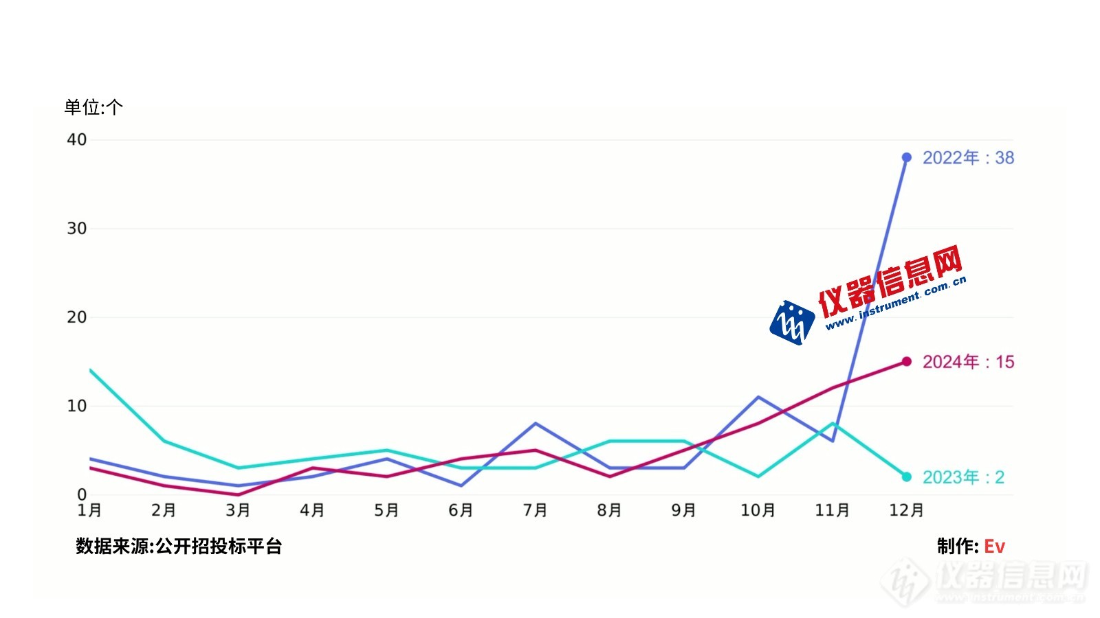 从近三年的中标数据分析来看,相较于2022年Q4季度的“井喷式”爆发,2023年与2024年高内涵细胞成像分析系统采购需求回归“常态化”。其中,2024年Q4季度采购需求相对旺盛,采购数量分别是8台(10月)、12台(11月)和15台(12月),合计35台,全年占比达58.33%。