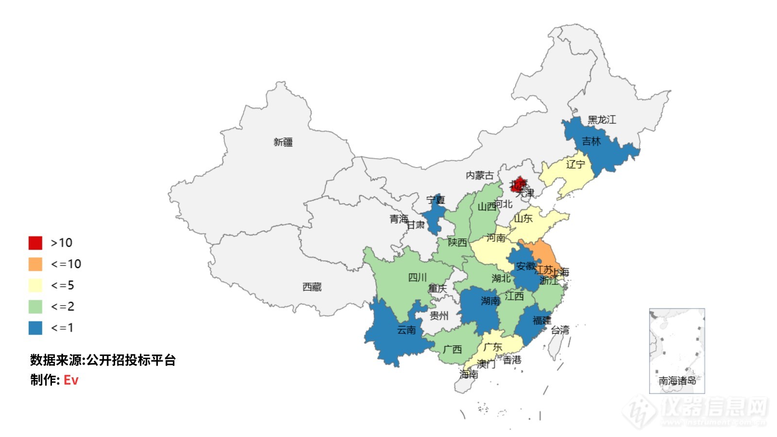 “京苏”两地需求旺盛,12月中标数量最多从采购地区分布来看,共涉及20个省份及直辖市。北京、江苏、辽宁和山东四个地区仪器采购数量≥5台,其中北京地区采购量最大,在2024年共采购了12台高内涵细胞成像分析系统,其次是江苏地区,共采购7台仪器。从整体分布来看,教育资源的集中分布在某些特定的程度上对仪器采购有所影响。